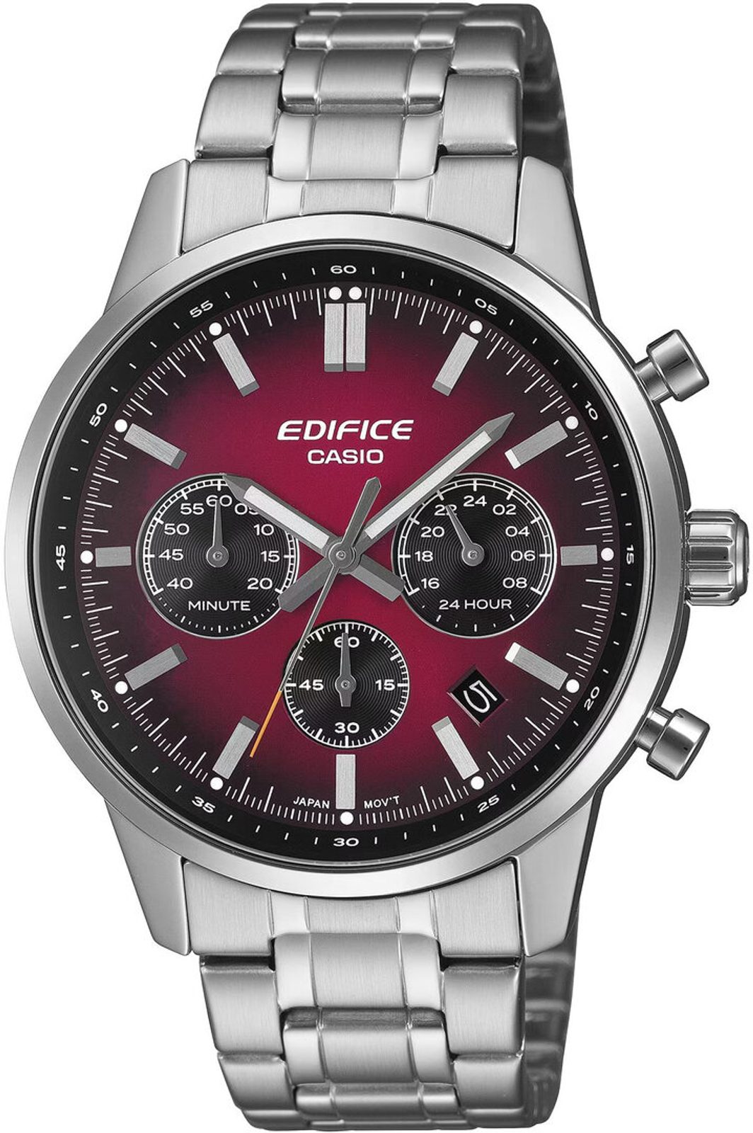 Culoarea roșie gradient a cadranului conferă Casio EFR 575D-4A din gama Edifice un sentiment de profunzime. Stilul de curse este susținut nu numai de subcadrane, ci și de butoanele clasice ale cronometrului și de luneta îngustă care flanchează geamul.