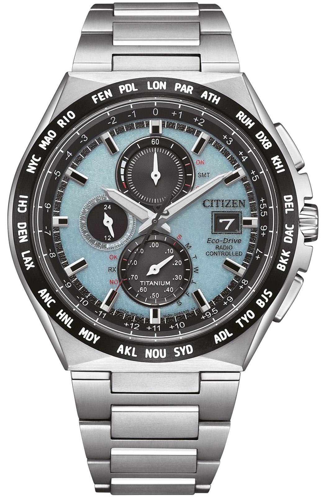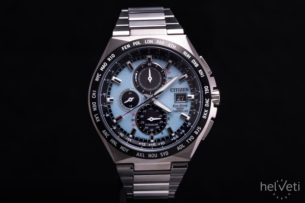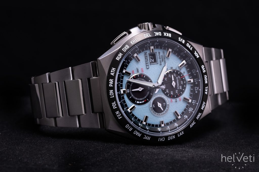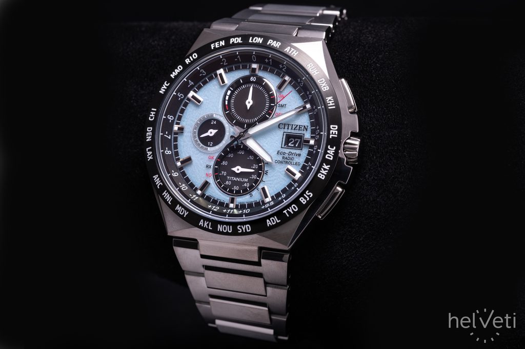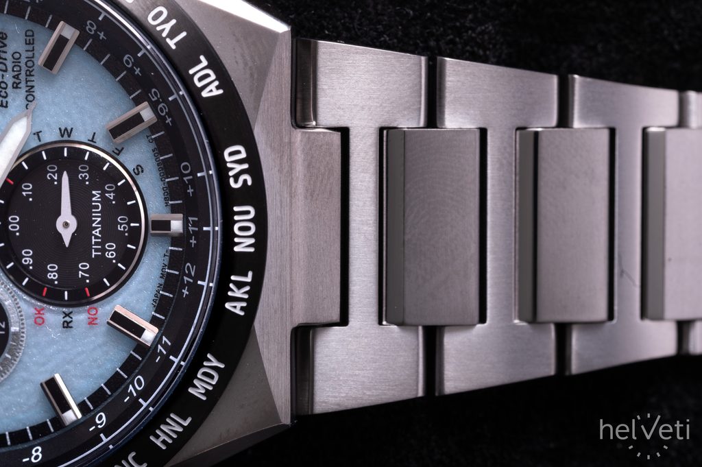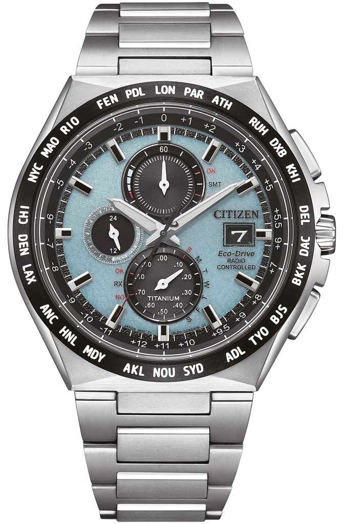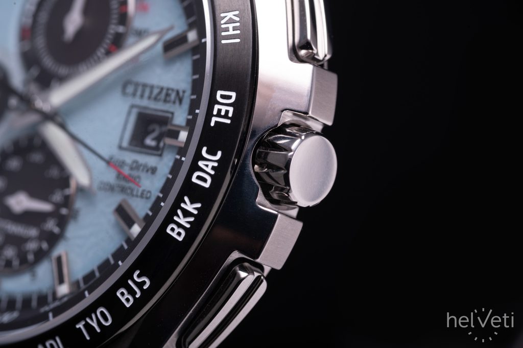 Carcasa, inclusiv brățara ceasului Citizen AT8238-84M, este fabricată din Super Titanium™, care asigură greutate redusă și proprietăți antialergice complete. În interiorul acestei carcase funcționează mișcarea Citizen H800, care oferă o oră absolut precisă datorită sistemului Radio-Controlled, adică sincronizarea orei prin semnal radio. Puteți conta și pe alte funcții, cum ar fi indicarea bateriei, prevenirea supraîncărcării, avertizarea în caz de încărcare insuficientă prin salturi de două secunde ale mâinii secunde sau trecerea la modul de economisire a energiei. De asemenea, puteți utiliza funcția cronometru cu o precizie de 1/20 s sau subcadranul de 24 de ore din poziția orei 9. Foarte practică este afișarea datei și a zilei săptămânii.