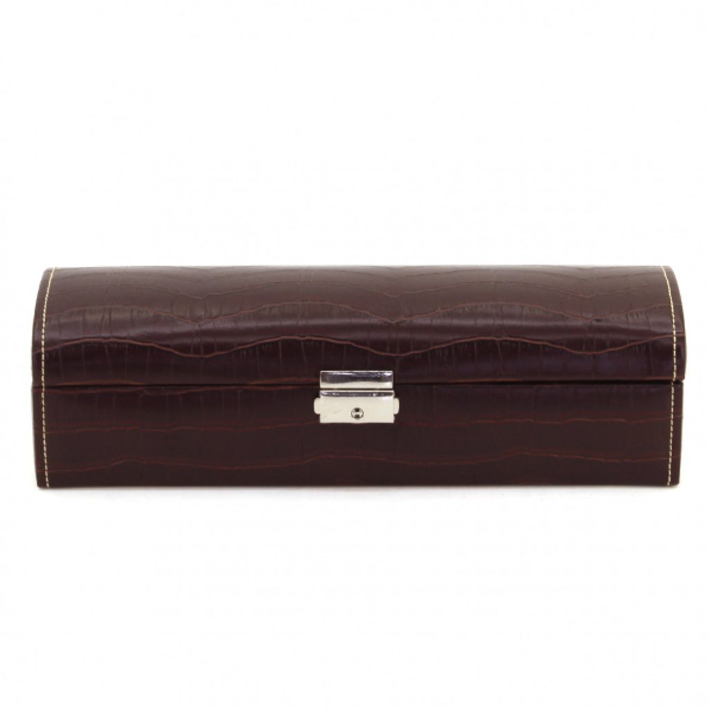 Cutie elegantă Friedrich Lederwaren Le Croc 20120-3 pentru 5 ceasuri. Fabricată din material sintetic de culoare maro, cu model de crocodil. Interiorul cutiei este de culoare galbenă.