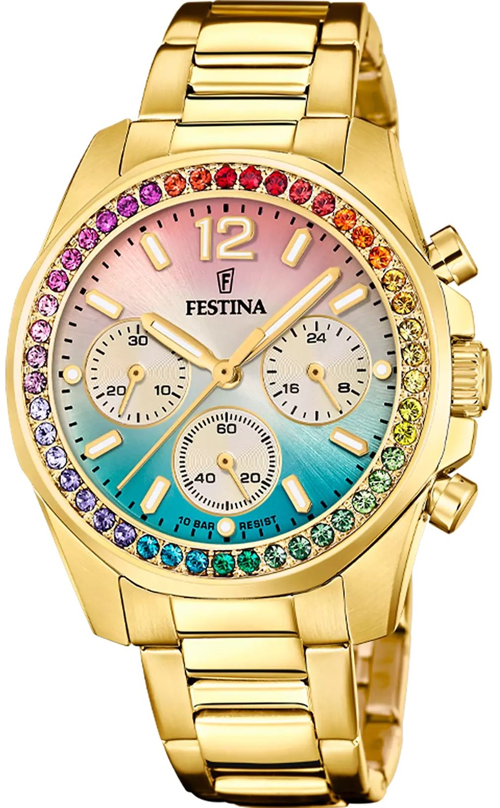 Frumosul cadran curcubeu este încadrat de pietre decorative în culorile curcubeului, care strălucesc foarte frumos, mai ales în lumina soarelui. Pe cadran există un total de 3 subcadrane, care sunt utilizate pentru funcția cronometru. Indicii și mâinile cu strat luminescent sunt, de asemenea, izbitoare cu finisajul lor auriu.