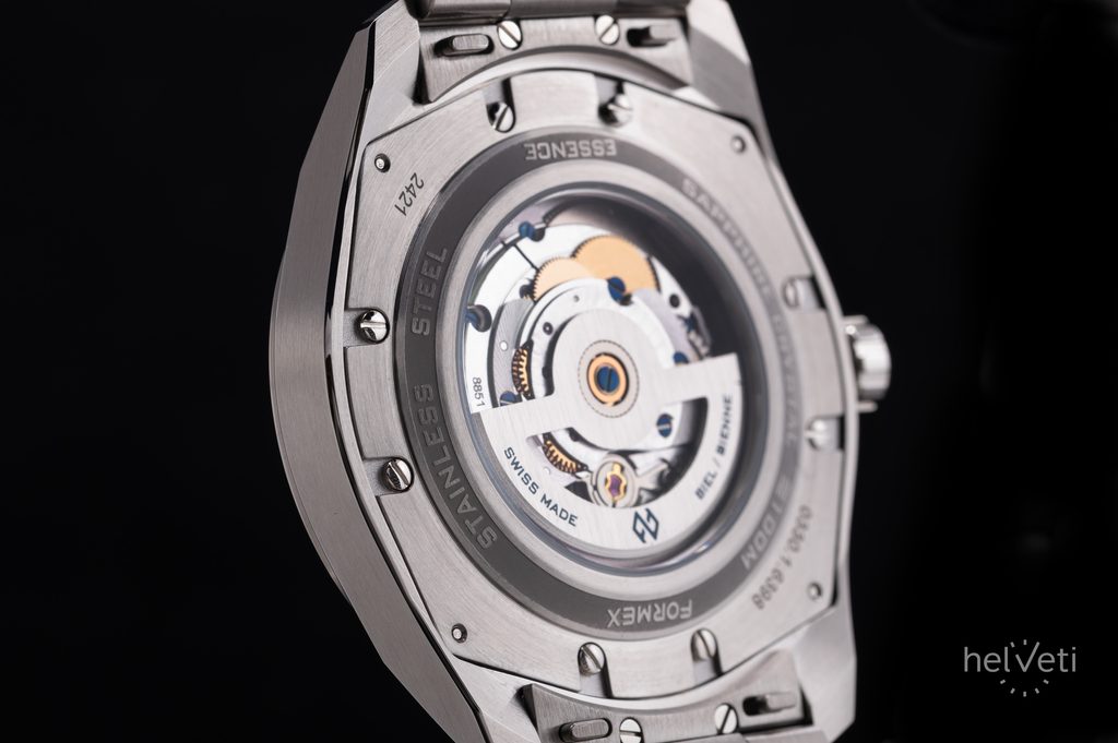 Printre caracteristicile clasice ale ceasului Formex Essence ThirtyNine Automatic Chronometer Space Glacier se numără cadranul argintat din meteorit, sistemul de suspensie Case Suspension System, rezistența ridicată la apă și închiderea cu microreglaj. Cadranul lizibil este protejat de o sticlă din safir cu tratament antireflex pe interior și rezistență ridicată la zgârieturi. Safirul a fost utilizat și pentru capacul transparent, prin care se poate observa funcționarea mecanismului decorat cu șuruburi albăstrite. Vizibilitatea îmbunătățită în condiții de lumină scăzută este asigurată de materialul luminos (BGW9 Super-LumiNova) aplicat pe ace și indici. Cadranul din meteorit, de culoare roz-auriu, și indicii cu finisaj lucios creează un efect foarte interesant. Impresia generală este completată de indicatorul de dată la poziția orei 6. Ceasul se remarcă prin versatilitatea sa, fiind potrivit atât pentru sport, activități acvatice, cât și pentru utilizarea zilnică.