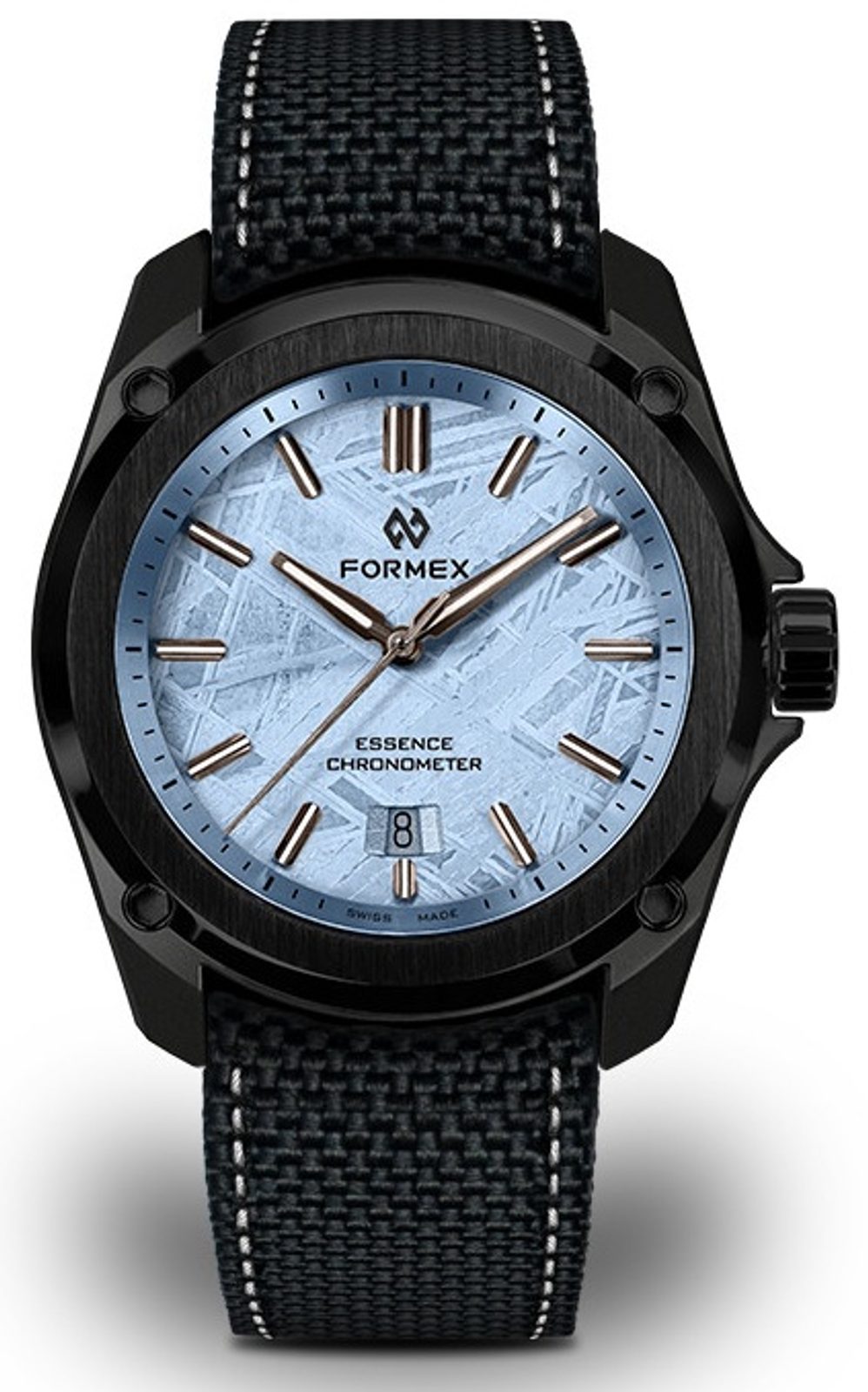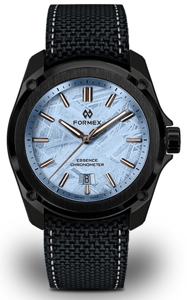 Formex Essence Leggera FortyOne Automatic Chronometer Space Glacier extind oferta de ediții speciale, care sunt făcute unice de cadranul lor. În acest caz, cadran din meteorit, care este placat cu 98% argint. Pe meteorit se aplică, prin placare galvanică, un strat de 98% argint, urmat de aplicarea manuală a șase straturi de lac transparent zapon teintée. Este un lac fin, transparent, pe bază de celuloză, cu o picătură de culoare albastră.