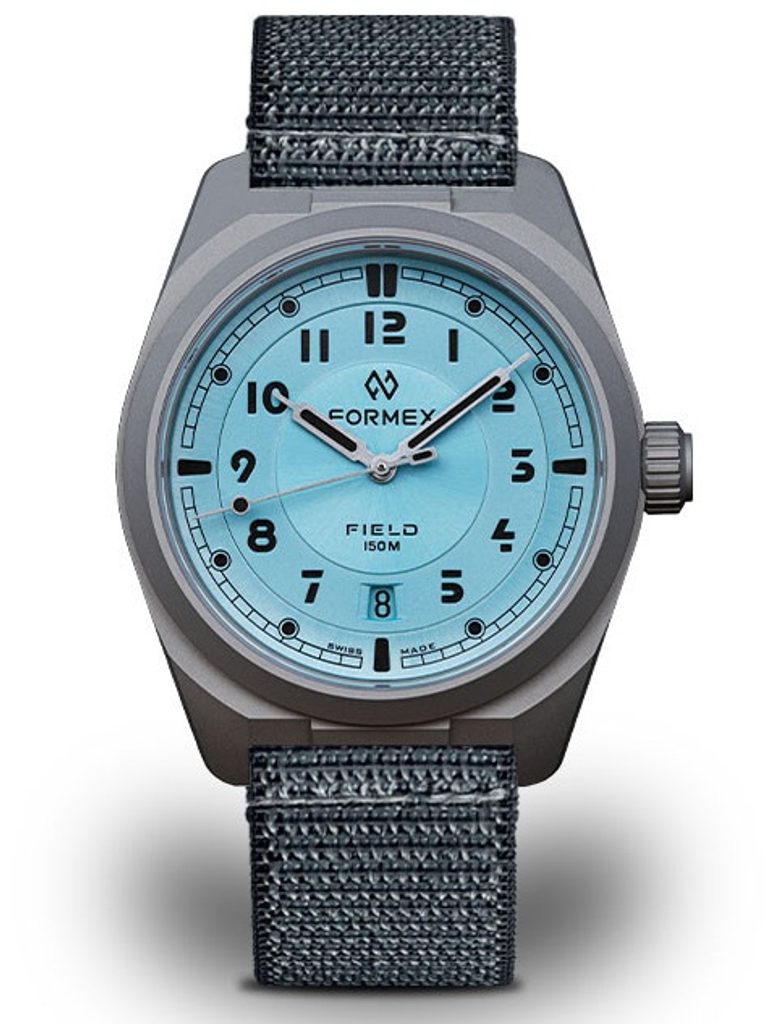 Semnele distinctive clasice ale ceasului Formex Field Automatic Gen 2 Ice Blue de inspirație militară includ mâinile și cifrele tăiate în formă de seringă distinctive și ușor de citit la pozițiile orelor, coroana ușor de manevrat, rezistența mai mare la apă și carcasa cu șurub. Cadranul perfect clar cu centrul tăiat este protejat de un cristal de safir cu strat intern antireflex și rezistență ridicată la zgârieturi. Lizibilitatea îmbunătățită în condiții de lumină scăzută este asigurată de luminescența (blacked-out Super-LumiNova® Grade A) de pe mâini, cifre și indici. Cifrele încastrate și indicii orelor, împreună cu centrul ridicat și marginea exterioară, conferă cadranului o adâncime vizibilă. Toate acestea sunt accentuate de indicatorul de dată proiectat cu sensibilitate din poziția orei 6, cu o coroană în culoarea cadranului. Ceea ce veți aprecia cel mai mult la acest ceas este versatilitatea sa; setul său de caracteristici îl face ideal pentru utilizarea în sport, în apă și pentru utilizarea zilnică.