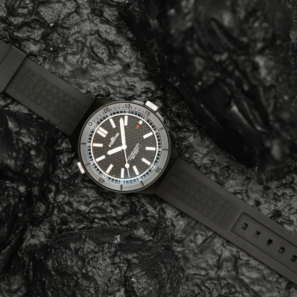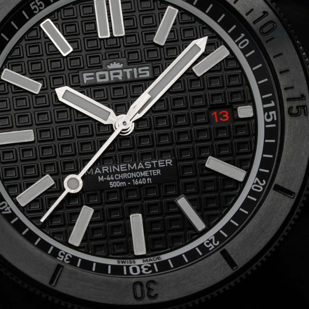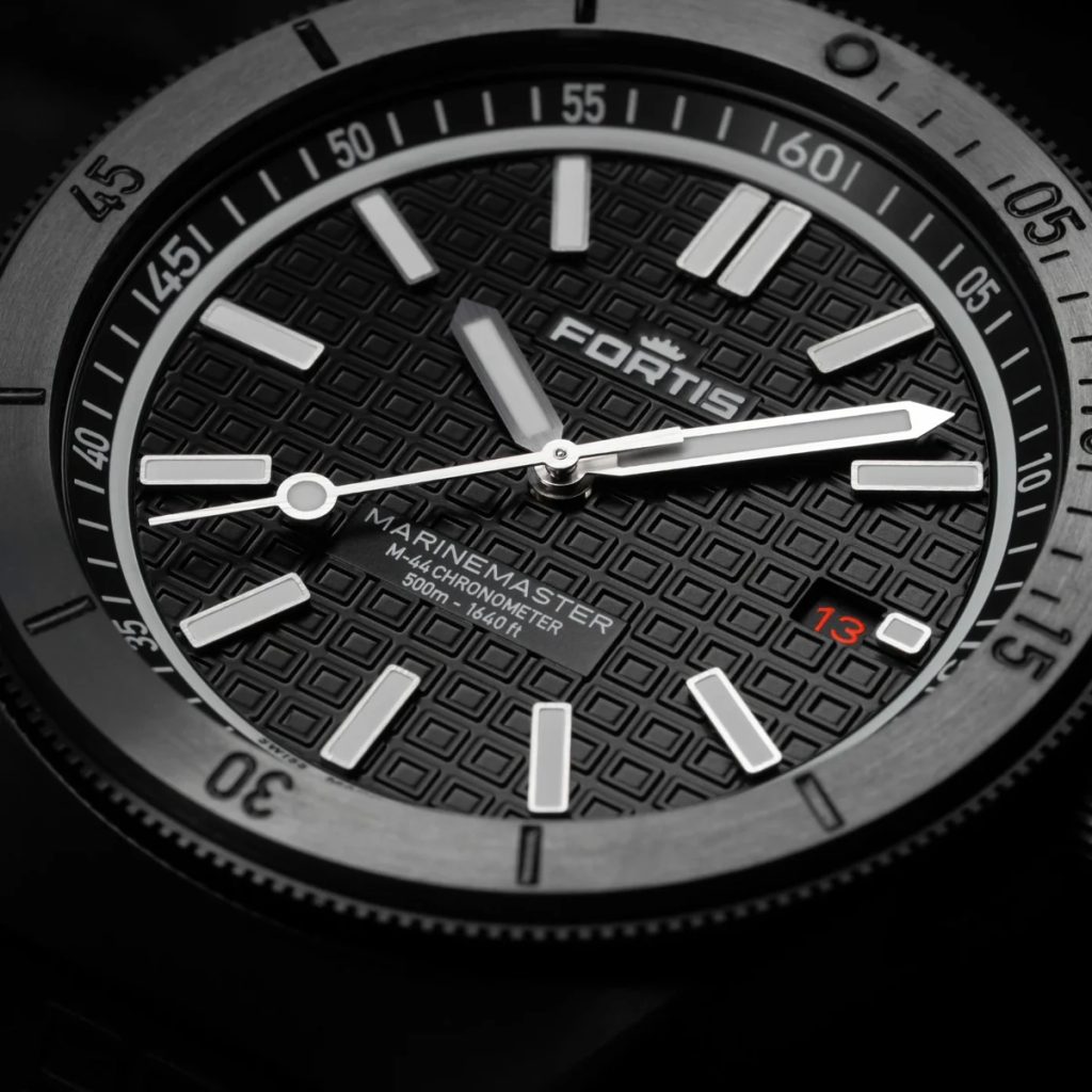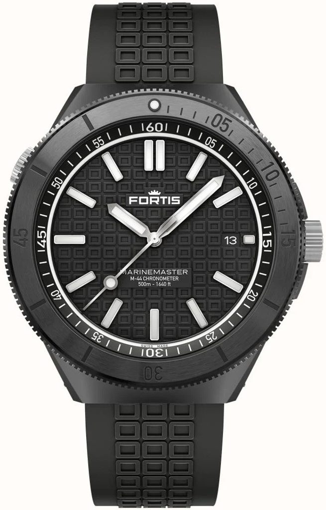 Fortis Marinemaster M-44 DLC Gravity Black COSC F8120030 are o carcasă din oțel inoxidabil reciclat cu tratament DLC, care este completată de o curea din cauciuc flexibil. Tratamentul DLC al carcasei asigură o rezistență sporită la zgârieturi datorită durității sale. Mișcarea de fabricație mecanică elvețiană Fortis WERK 11 (fabricată pentru Fortis de Kenissi) cu înfășurare automată funcționează fiabil în carcasă. Aceasta funcționează la o frecvență de 28.800 de semifrecvențe pe oră și are 26 de bijuterii și, mai presus de toate, o rezervă de putere extinsă la 70 de ore. Mașina are, de asemenea, o funcție de "hacking" (oprirea mâinii secunde atunci când este comandată) și posibilitatea de înfășurare manuală a coroanei. În poziția orei 3 găsim un afișaj practic al datei. Lunetă de scufundare rotativă bidirecțional cu posibilitatea de blocare prin "Fortis Lock System®" (la ora 10) permite măsurarea perioadelor de timp.