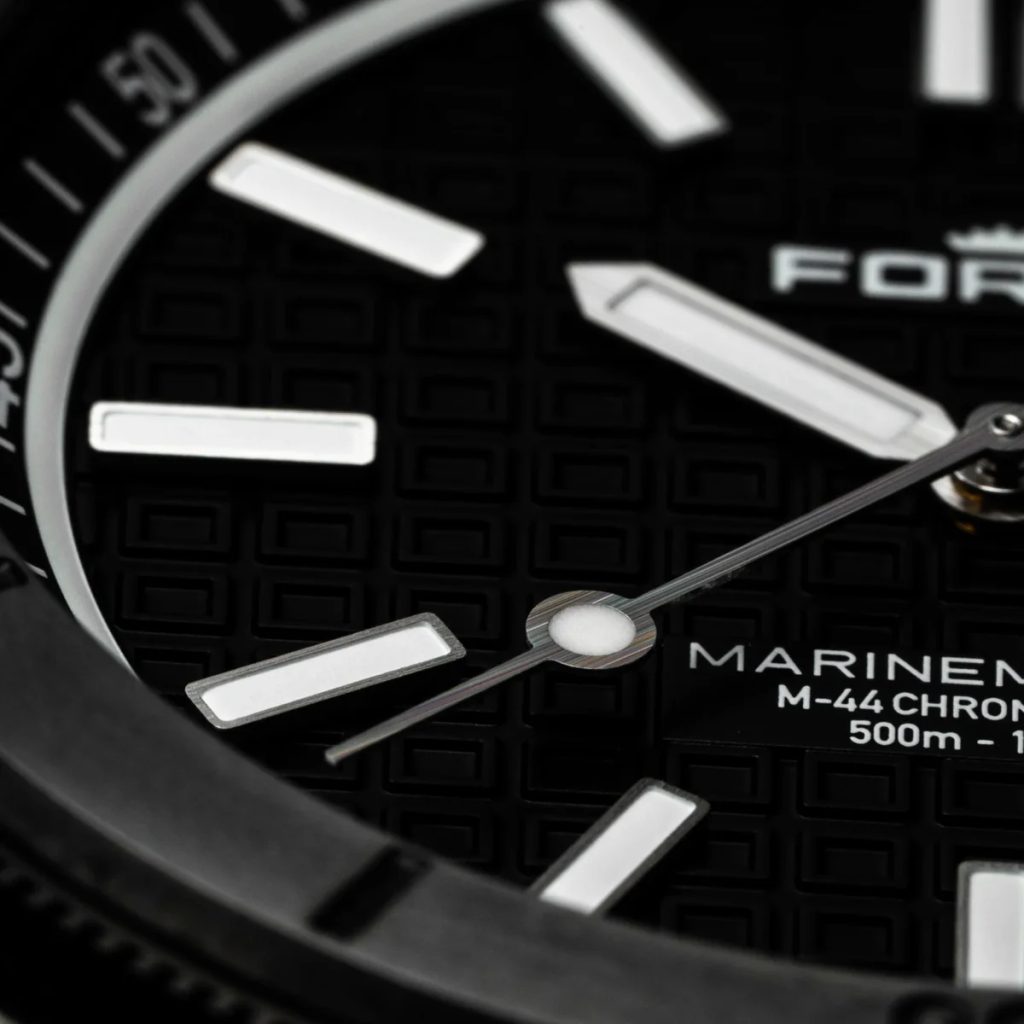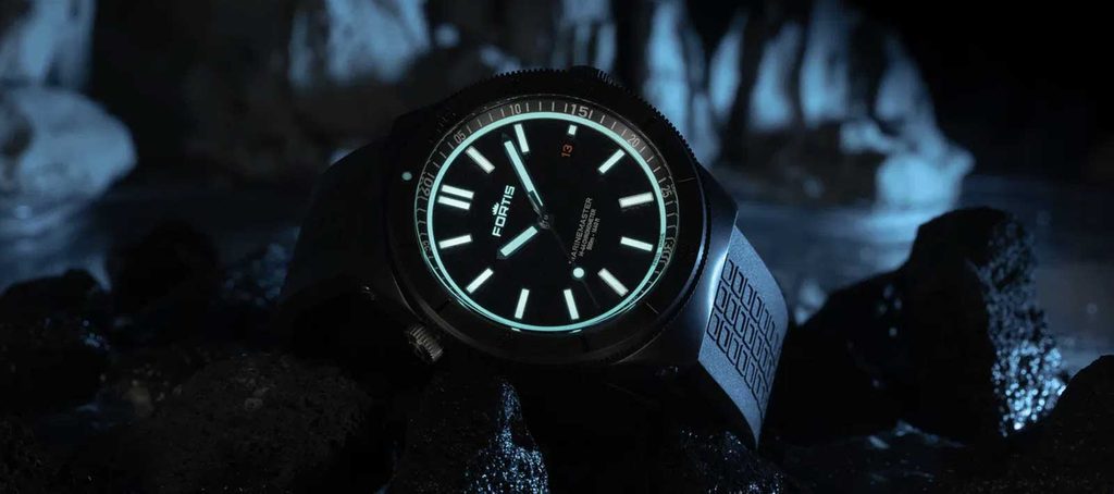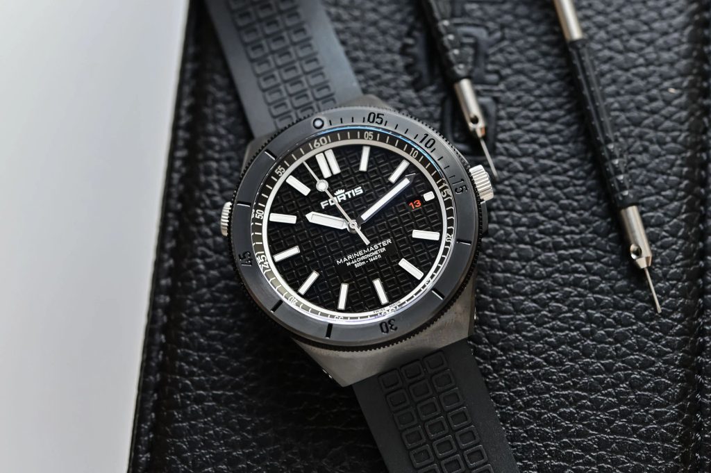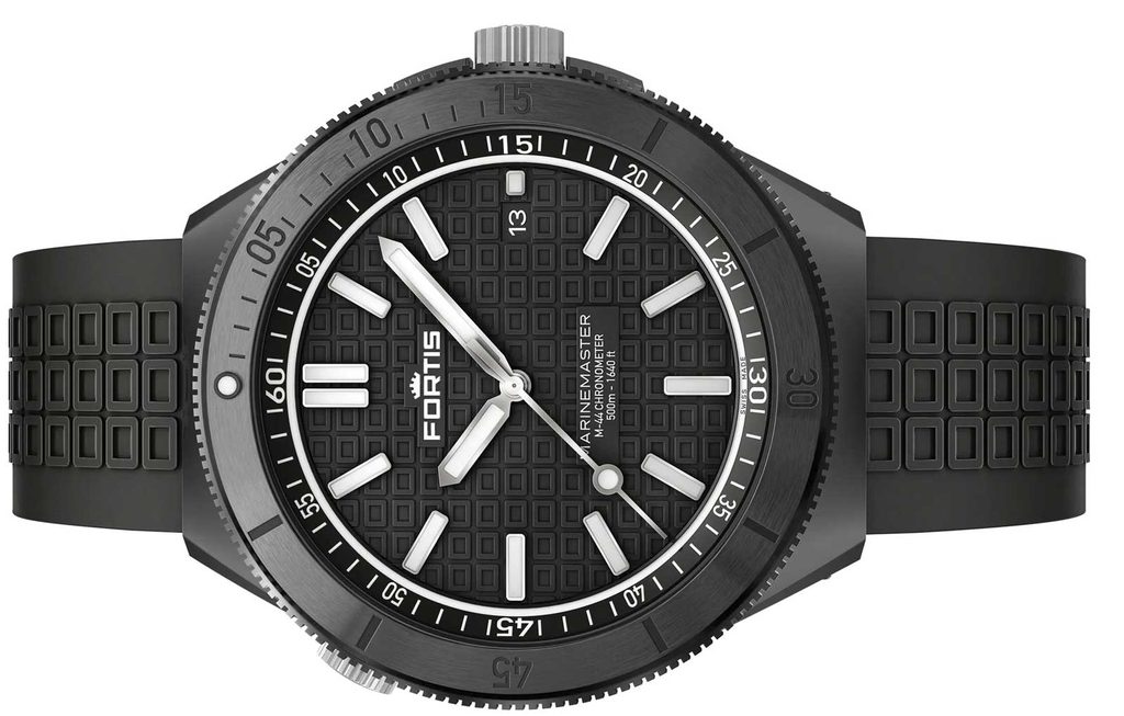 Fortis Marinemaster M-44 DLC Gravity Black COSC F8120030 are o carcasă din oțel inoxidabil reciclat cu tratament DLC, care este completată de o curea din cauciuc flexibil. Tratamentul DLC al carcasei asigură o rezistență sporită la zgârieturi datorită durității sale. Mișcarea de fabricație mecanică elvețiană Fortis WERK 11 (fabricată pentru Fortis de Kenissi) cu înfășurare automată funcționează fiabil în carcasă. Aceasta funcționează la o frecvență de 28.800 de semifrecvențe pe oră și are 26 de bijuterii și, mai presus de toate, o rezervă de putere extinsă la 70 de ore. Mașina are, de asemenea, o funcție de "hacking" (oprirea mâinii secunde atunci când este comandată) și posibilitatea de înfășurare manuală a coroanei. În poziția orei 3 găsim un afișaj practic al datei. Lunetă de scufundare rotativă bidirecțional cu posibilitatea de blocare prin "Fortis Lock System®" (la ora 10) permite măsurarea perioadelor de timp.