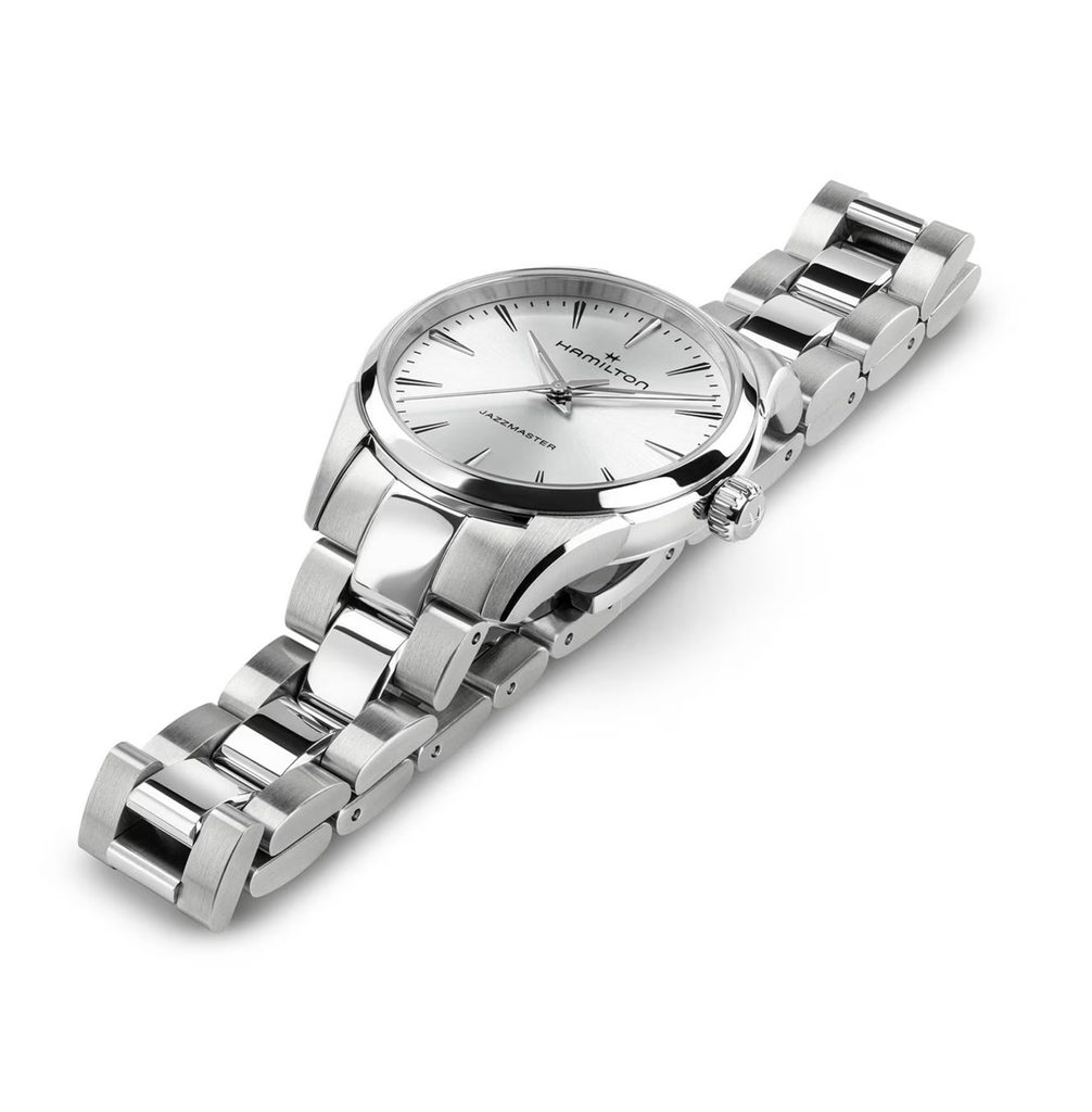 Atemporal și rafinat, modelul Jazzmaster Quartz 32 mm impresionează prin cadranul argintiu cu efect sunburst și arătătoarele scheletate în stil Dauphine care adaugă o notă modernă designului tradițional. Carcasa ultra-subțire combină detaliile tăiate cu precizie și lustruite pentru a crea o siluetă elegantă și subțire. Un ceas social clasic conceput pentru un rafinament natural.