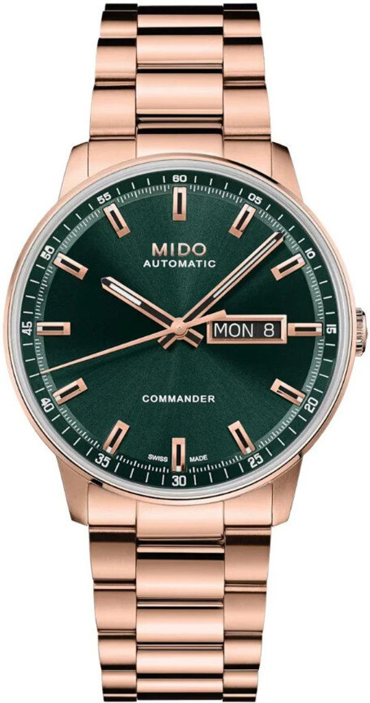 Ceasul Mido M021.430.33.091.00 are o carcasă, inclusiv brățara, din oțel inoxidabil 316L cu un finisaj PVD în aur roz. În interiorul său, mișcarea mecanică elvețiană Mido Caliber 80 (bazată pe ETA C07.621) cu înfășurare automată ticăie fiabil. Aceasta funcționează la o frecvență de 21.600 de semifrecvențe pe oră, are 25 de bijuterii și, mai presus de toate, o rezervă de putere extinsă de 80 de ore. În poziția orei 3 găsim un afișaj practic al datei și al zilei săptămânii. Funcționarea acestei mișcări poate fi observată prin intermediul cadranului transparent.