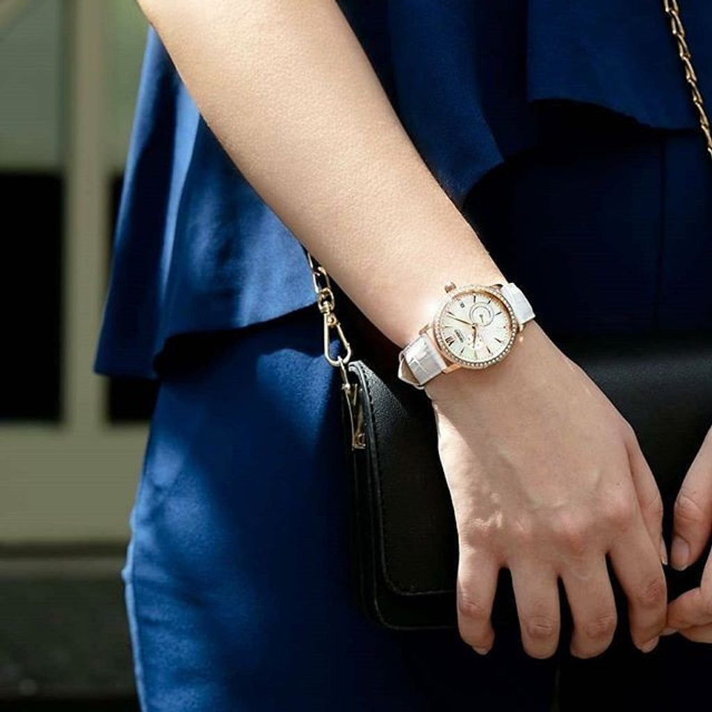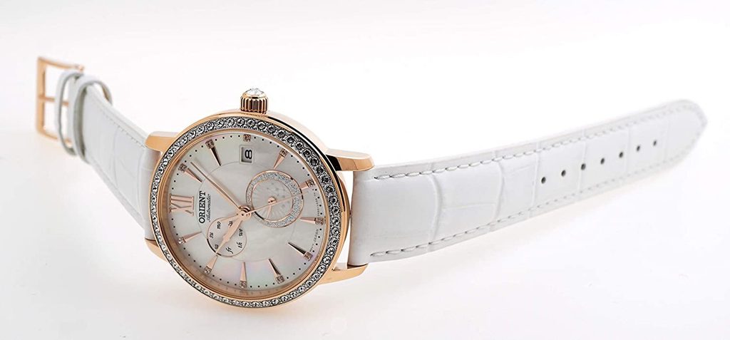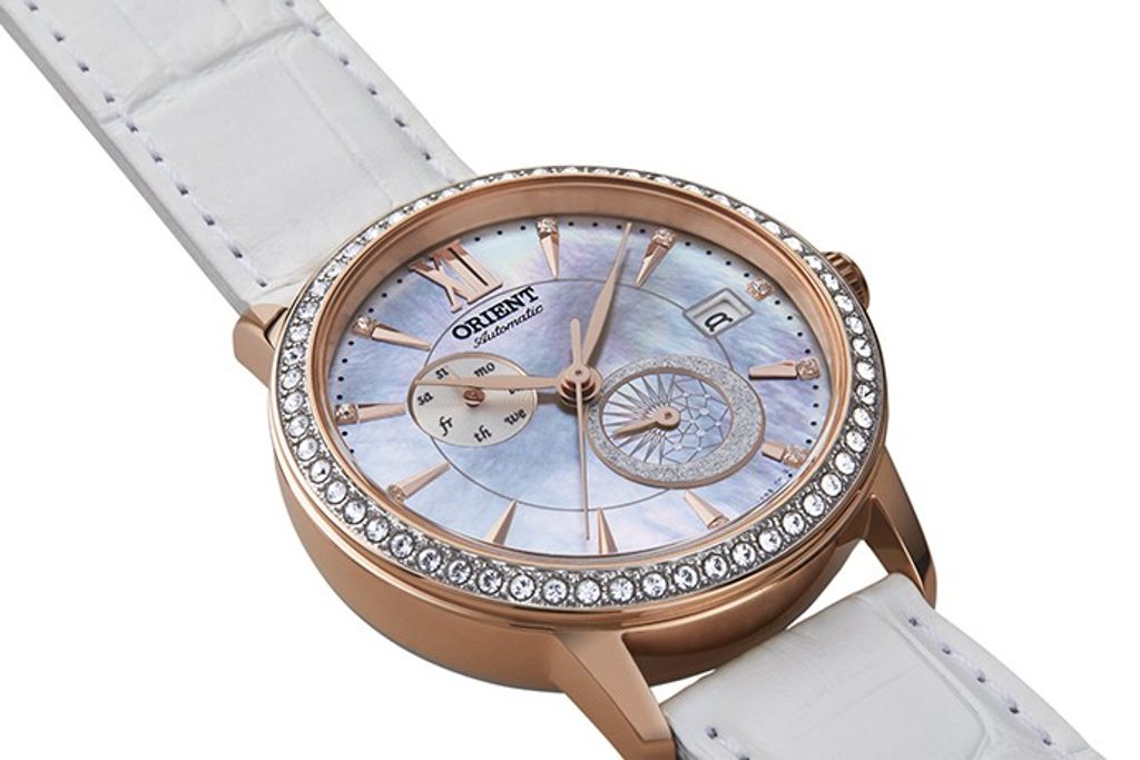 Perleťový ciferník je zdoben kamínky v subciferníku 24hodinového času na pozici 5. hodiny. Kamínky zároveň tvoří hodinové indexy, pozice 12. hodiny je osazena římskou číslicí. Poeticky vyvedený ciferník je chráněn minerálním sklíčkem. Nepřehlédnutelným prvkem je vedle číselníku a růžovozlaté PVD úpravy povrchu pouzdra luneta osázená krystaly a zdobná korunka s kamínkem. Celkový dojem dotváří použité jemné listové ručky a ladné tvary pouzdra. Hodinky nabízí funkci data na pozici 3. hodiny a dne v subciferníku na 10. hodině. Srdcem hodinek je mechanický strojek Orient F6B22 s automatickým nátahem a rezervou chodu kolem 40 hodin. Chod strojku je možné sledovat také dýnkem s průhledem. Elegantnost hodinek umocňuje dodávaný kožený řemínek s krokodýlím vzorem. Hodinky disponují vodotěsností 30 m, snesou tak náhodný kontakt s vodou při mytí rukou a dešti.