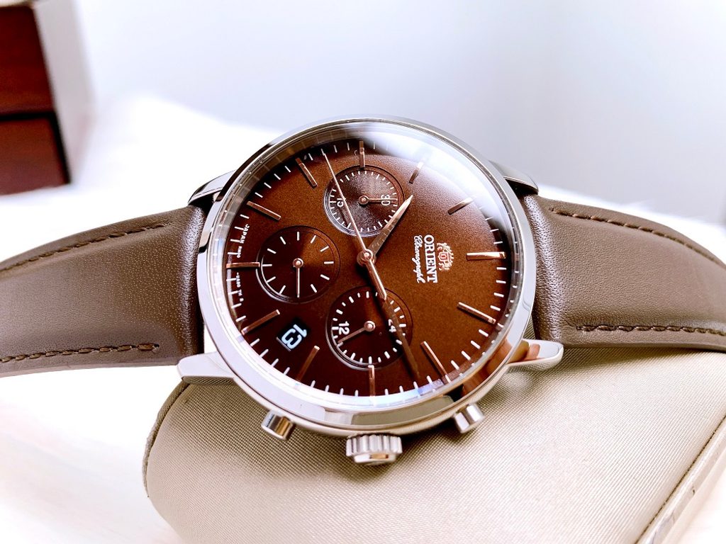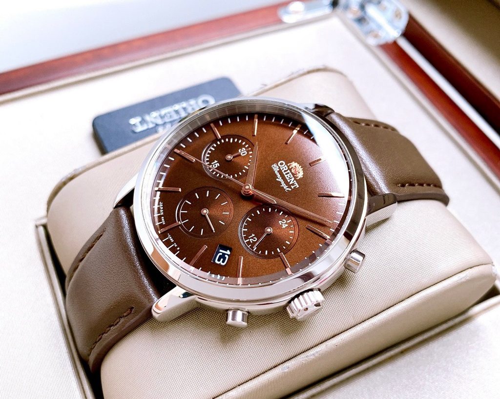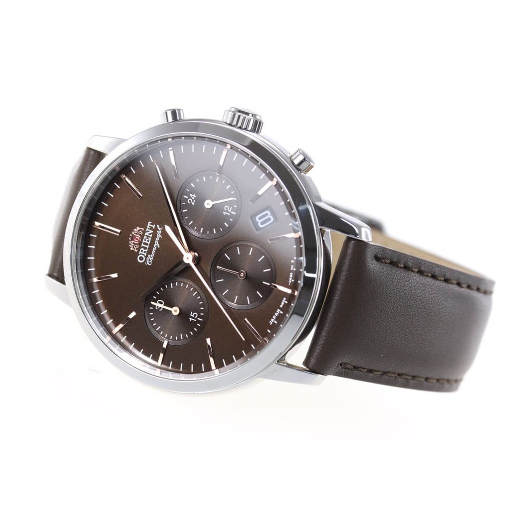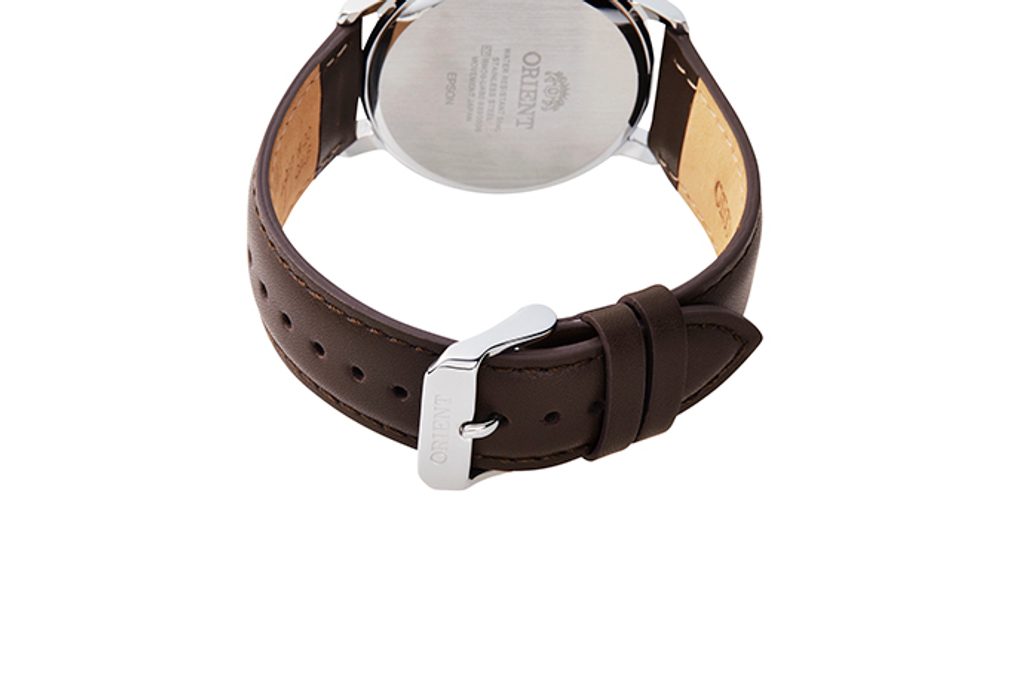 Pouzdro hodinek Orient RA-KV0304Y10B je vyrobeno z ušlechtilé oceli a v jeho nitru najdeme japonský bateriový strojek Orient RMD00. Ten disponuje ukazatelem data na pozici půl páté, 24hodinovým zobrazením času na pozici 3. hodiny a funkcí stopek s možností meření až 30minutových intervalů. Hnědému číselníku vévodí minimalismus, který hodinkám nijak neubírá na skvělé čitelnosti.