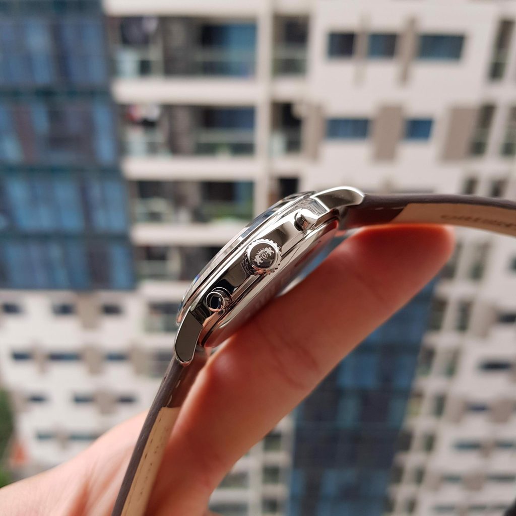 Jednoduchý, výborně přehledný číselník je chráněn minerálním sklem. Voděodolnost tohoto modelu je 50 m, což zaručuje odolnost například při mytí rukou, nebo dešti. Hodinky jsou dodávány na hnědém koženém řemínku. Díky průměru pouzdra 40,4 mm skvěle padnou na zápěstí každého muže, který hledá společensky laděné hodinky.