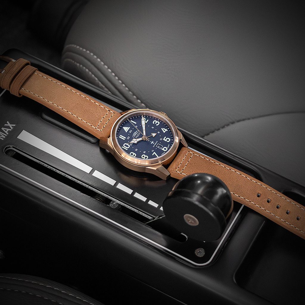 Cadranul este decorat cu o structură originală sablată, care este completată de indici numerici luminescenți din plastic special concepuți, care fac ceasul perfect lizibil chiar și în condiții de lumină scăzută. După cum veți recunoaște cu toții, în poziția orei 12 veți găsi un indicator lateral de alunecare din orizonturile contemporane. Adevărații cunoscători nu vor rata silueta legendarului antrenor cehoslovac Albatros L-39 pe cadranul în sine și acum și pe mâna a doua.