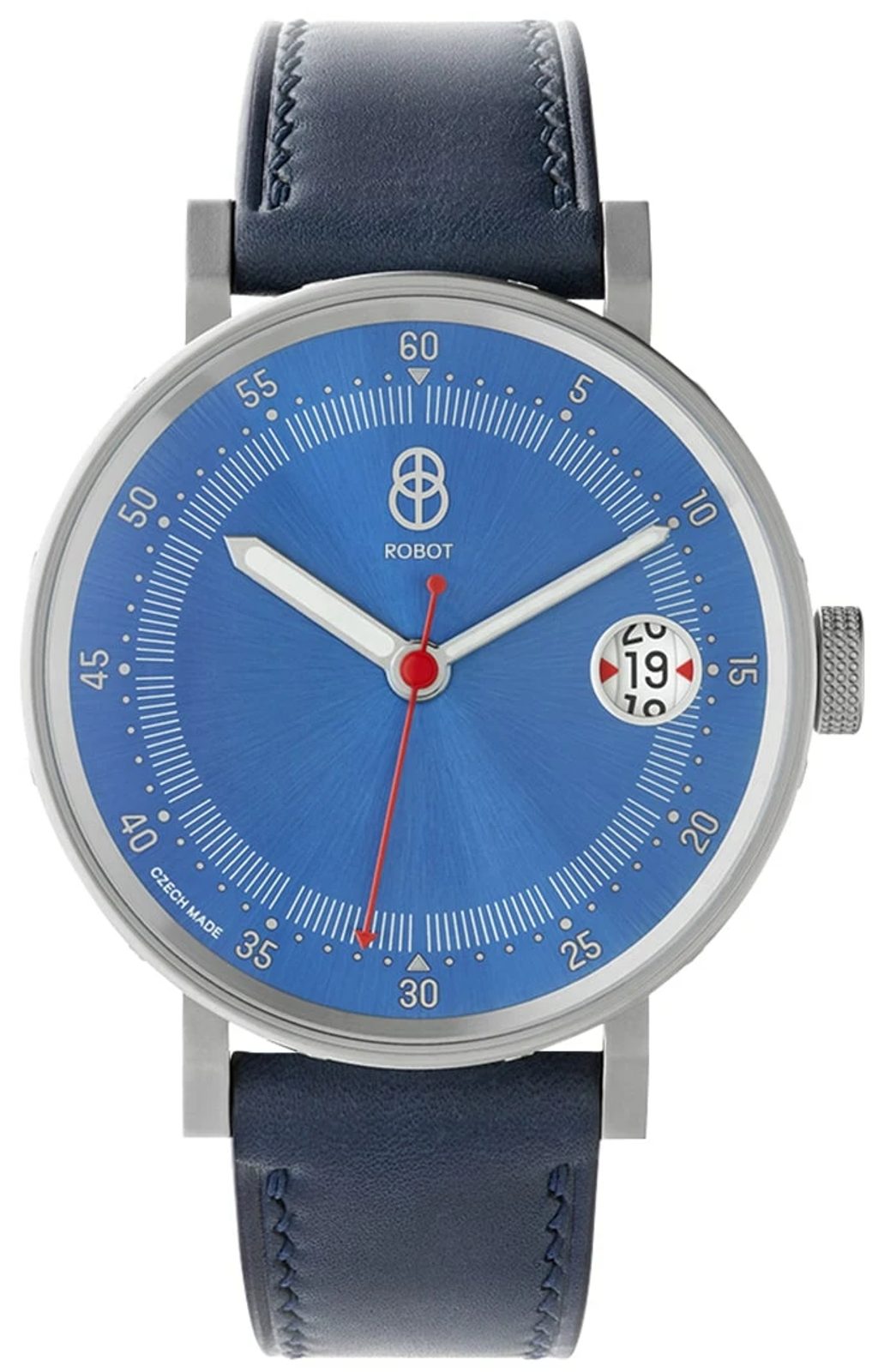 Modelul Robot Graphic Sutnar Elephant Blue are un cadran în relief realizat prin tehnica electroformării, astfel încât scara minutelor și marcajele numerice ale minutelor de pe pozițiile orelor ies în evidență de pe suprafața cadranului. Suprafața cadranului este decorată cu o tăietură Sunburst, care are grijă de un efect plăcut în lumina directă a soarelui. Întregul ansamblu este completat în mod corespunzător de mâinile frezate distinctive, umplute manual cu luminescență pentru o mai bună lizibilitate în condiții de lumină scăzută, și de mâna contrastantă colorată pentru secunde.