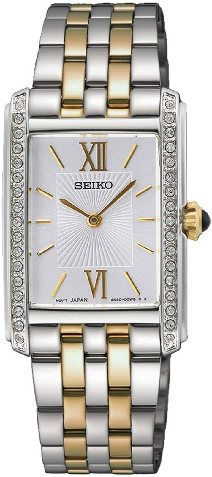Ceasul Seiko SWR093P1 este, datorită execuției și designului său, un accesoriu potrivit pentru ocazii sociale, dar și pentru purtare zilnică. Carcasa dreptunghiulară a ceasului este realizată din oțel inoxidabil și decorată cu 34 de cristale, fiind completată de o brățară simplă cu zale în cinci rânduri din același material, ambele în execuție bicolor. Clientele vor aprecia cadranul alb cu o structură fină radială. Cadranul este completat potrivit de ace și indici aurii la pozițiile orelor. Este protejat de sticlă minerală întărită Hardlex. Impresia generală elegantă a ceasului este completată și de coroana decorativă cu un caboșon albastru. Ceasul este acționat de mecanismul Seiko 4N30 alimentat cu baterie.