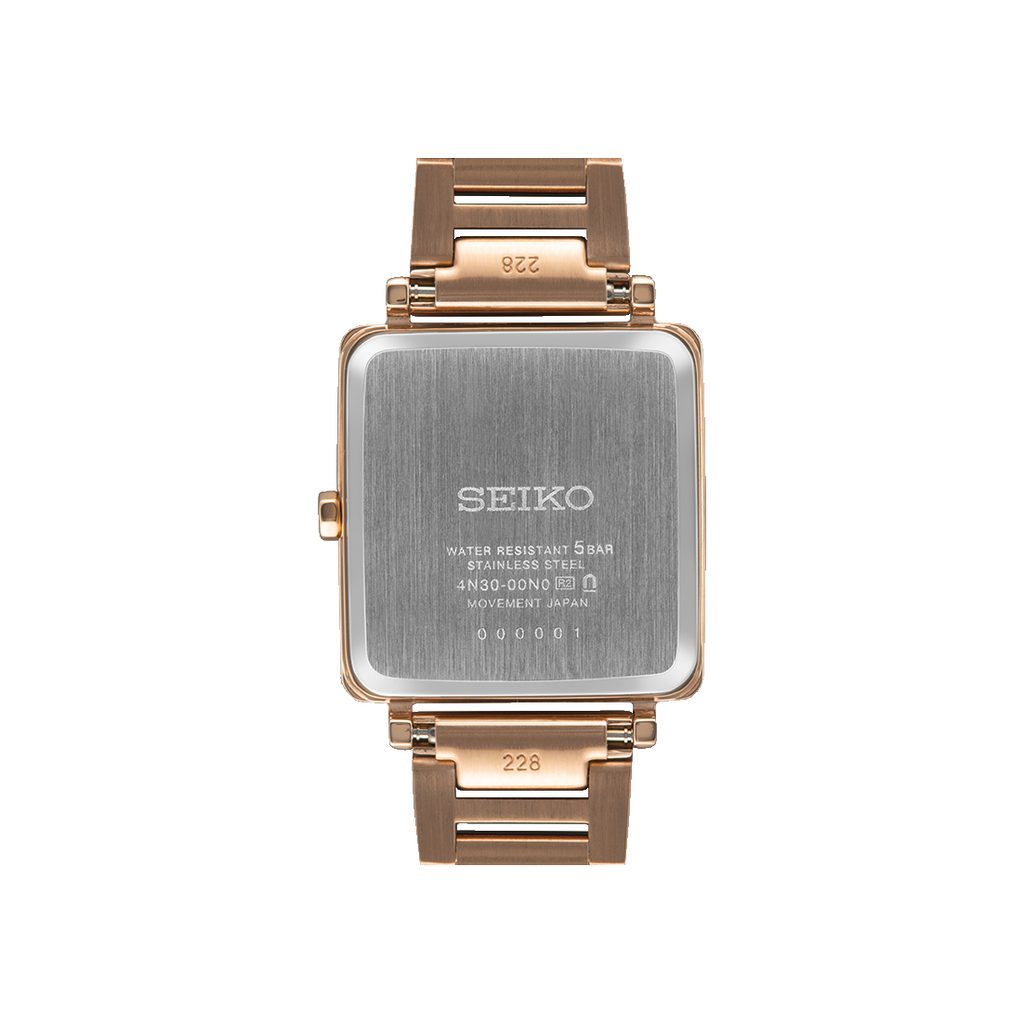 Ceasul Seiko SWR112P1 este, datorită aspectului său, un accesoriu potrivit pentru societate, dar și pentru purtare zilnică. Carcasa dreptunghiulară a ceasului este realizată din oțel inoxidabil, fiind completată de o brățară simplă cu zale din același material, ambele cu finisaj roz-auriu. Clientele vor aprecia cadranul decorativ cu o textură fină radială în centru. Cadranul este completat potrivit de ace și indici înnegriți la pozițiile orelor. Este protejat de sticlă minerală întărită Hardlex. Ceasul este pus în mișcare de mecanismul Seiko 4N30 alimentat cu baterie.