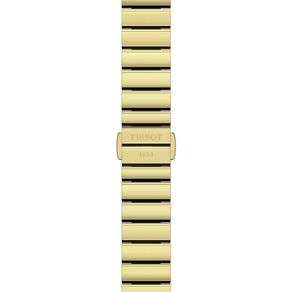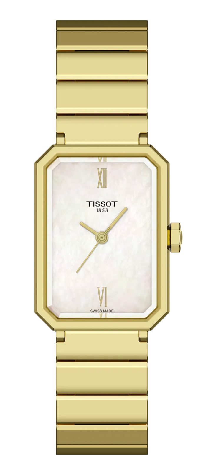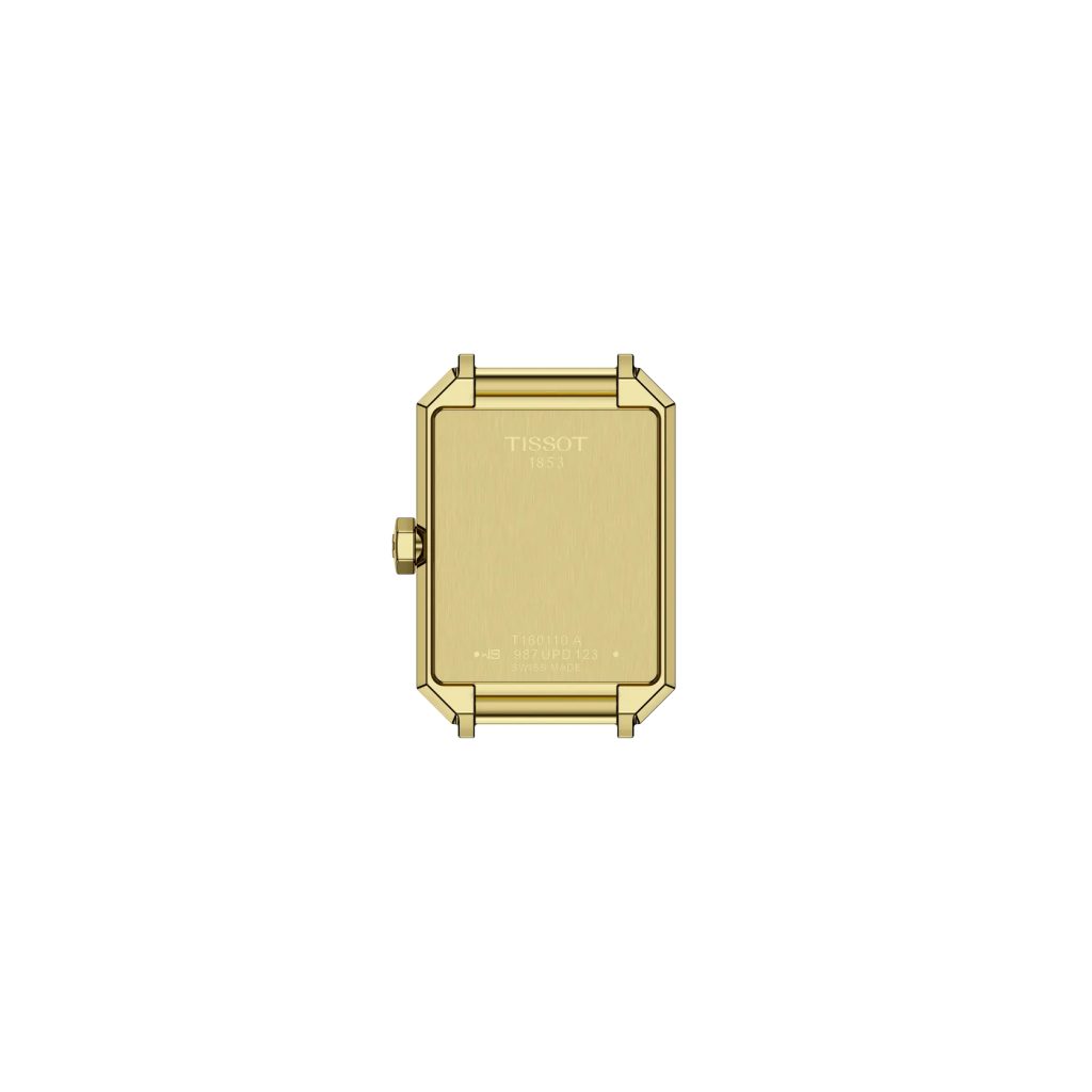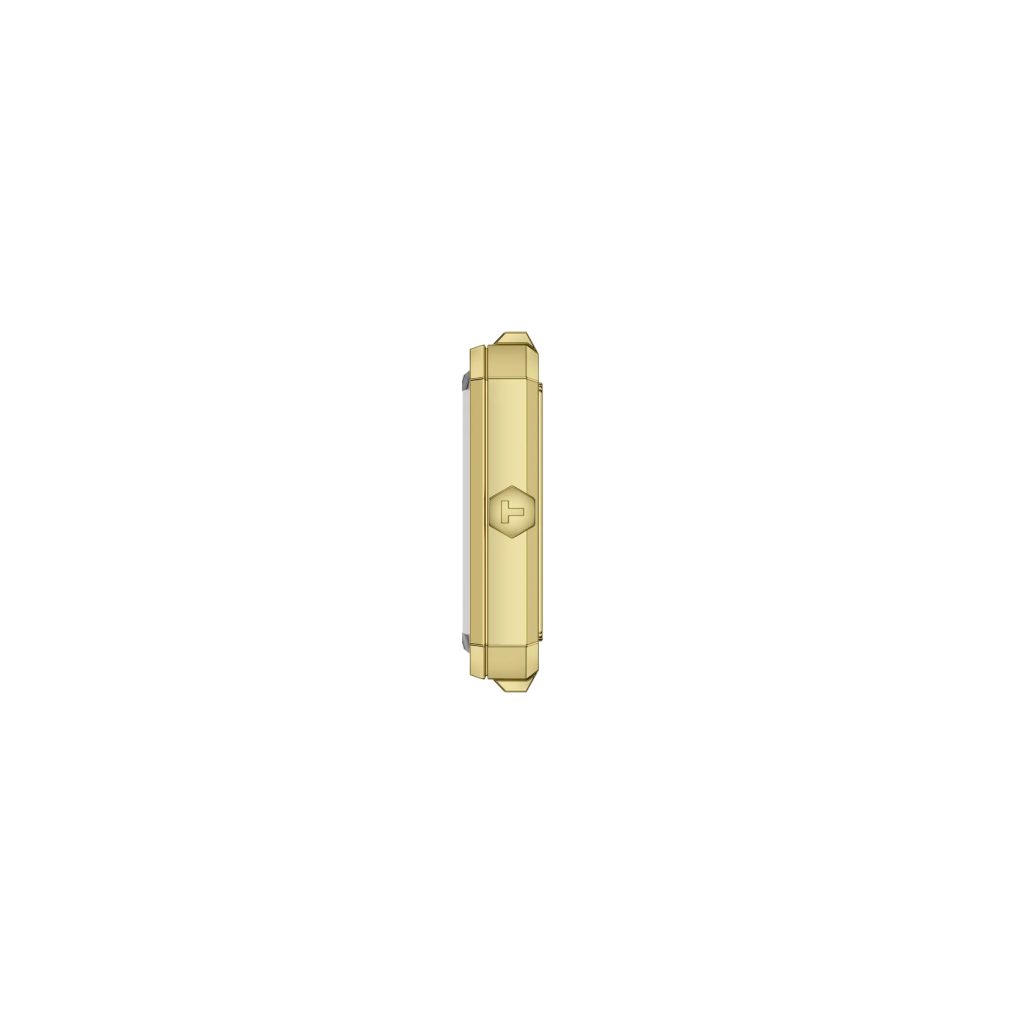 Carcasa de formă dreptunghiulară este fabricată din oțel inoxidabil, care este completată de o brățară din același material. Atât carcasa, cât și brățara sunt finisate în PVD aur galben. Coroana în formă de hexagon cu logo-ul mărcii este, de asemenea, o trăsătură caracteristică a carcasei. Cadranul alb din nucă de perle, curat și elegant, este protejat de un cristal de safir foarte rezistent la zgârieturi.