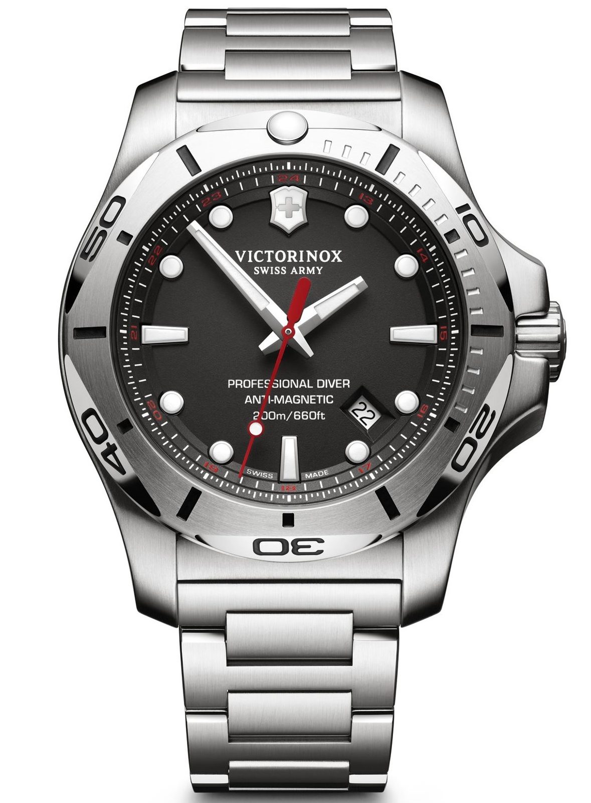 Švýcarské hodinky Victorinox z modelové řady I.N.O.X. s označením 241781 - novinka roku 2017, která toho vydrží opravdu hodně. Ocelové pouzdro, šroubovací korunka, antireflexní safírové sklíčko, hodinový strojek Ronda 715, ručičky a indexy s luminescenční vrstvou SuperLuminova, řemínek z ušlechtilé oceli a vodotěsnost do 200 metrů – to jsou vlastnosti, za kterými se skrývá neuvěřitelná výdrž.