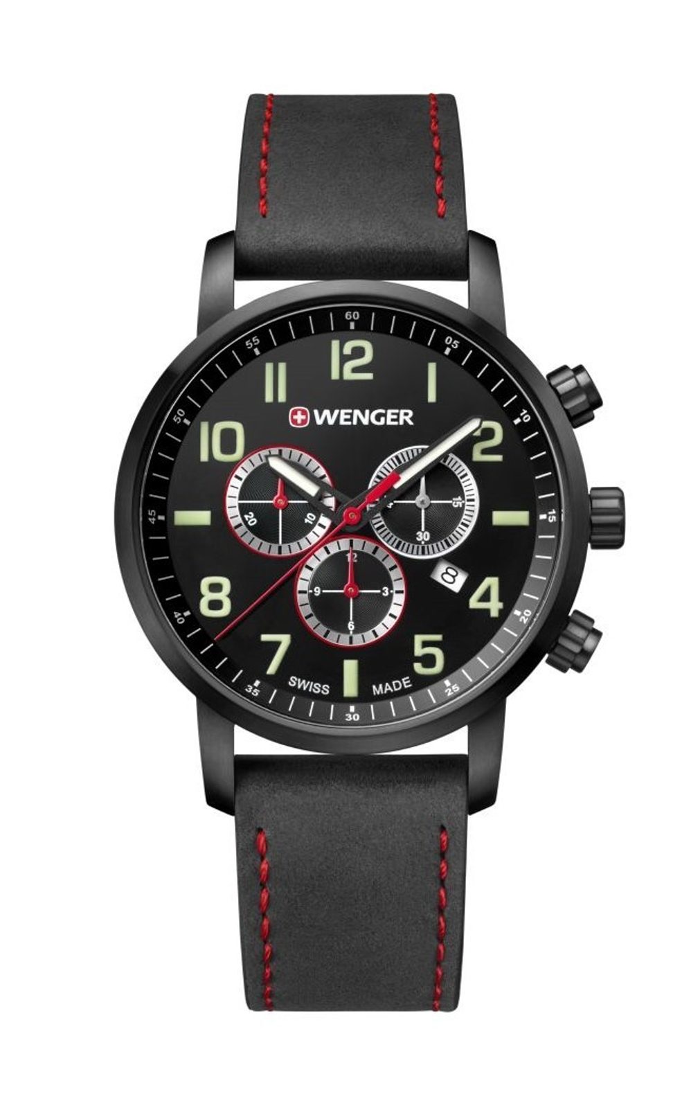 Model Wenger Attitude Chrono 01.1543.104 se dodává s kvalitním tlustým koženým řemínkem. Ciferník má podklad univerzální černé barvy. Hodinky jsou sportovně laděné, mimo jiné díky jejich vodotěsnosti 100 m, ale jsou vhodným doplňkem také k obleku, nebo slušnému oblečení.