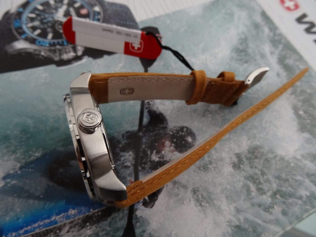 Modelová řada Escort přináší nové tvary a netradiční provedení. Na první pohled zaujme zkosené ocelové pouzdro, ze kterého vystupuje dominantní luneta upevněná čtyřmi viditelnými šroubky. Ta plynule přechází do minerálního sklíčka se safírovou úpravou, které chrání přehledný ciferník se třemi velkými indexy a malými vteřinovými indexy ve vnitřním ciferníčku. V horní části ciferníku je klasicky umístěn decentní znak Wenger a ve spodní části datumovka. Ručičky a body nad jednotlivými indexy jsou luminiscentní. Hodinky Wenger Escort 01.1051.102 kombinují světle hnědé indexy a pevný tlustý světlě hnědý kožený řemínek s černým podkladem ciferníku a ocelovým pouzdrem. Jedná se o velmi elegantní kombinaci, kterou můžeme jedině doporučit.