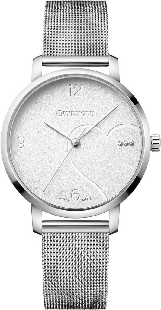 Dámské náramkové hodinky z modelové řady Metropolitan Donnissima. Hodinky Wenger Metropolitan Donnissima 01.1731.108 se hodí na každodenní nošení ale i do společnosti. Ciferník Vás na první pohled zaujme třemi Swarovski kamínky na pozici třetí hodiny. Hodinky disponují ocelovým pouzdrem a jemně tkaným mesh náramkem. Vodotěsnost tohoto modelu je 100m. V této modelové řadě oceníte minerální sklíčko potažené safírovým povlakem.