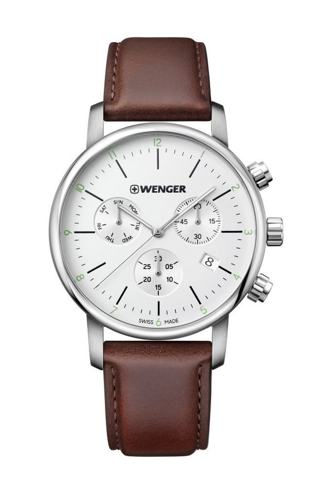Společensky laděné hodinky Wenger Urban Classic Chrono 01.1743.101 mají přehledný ciferník, který obsahuje ukazatel data, dne v týdnu a stopky. Hodinky z řady Wenger Urban Classic mají voděodolnost 100m a minerální sklíčko se safírovou úpravou. Pouzdro hodinek je vyrobeno z oceli, řemínek je kožený. Hodinky mají švýcarský strojek Ronda Z60, který pohání baterie.